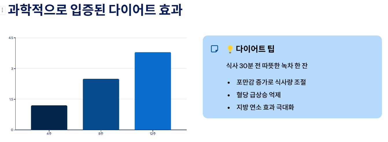 한 연구에 따르면, 12주 동안 녹차 추출물을 꾸준히 섭취한 그룹이 그렇지 않은 그룹보다 체지방률이 평균 3% 이상 감소했다고 해요.