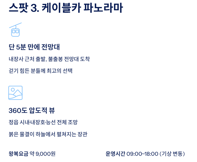 “케이블카에서 내려다본 단풍은 말 그대로 ‘불타는 가을’이었어요. 걷는 단풍길이 감성적이라면, 전망대는 압도적인 스케일 그 자체였습니다.”