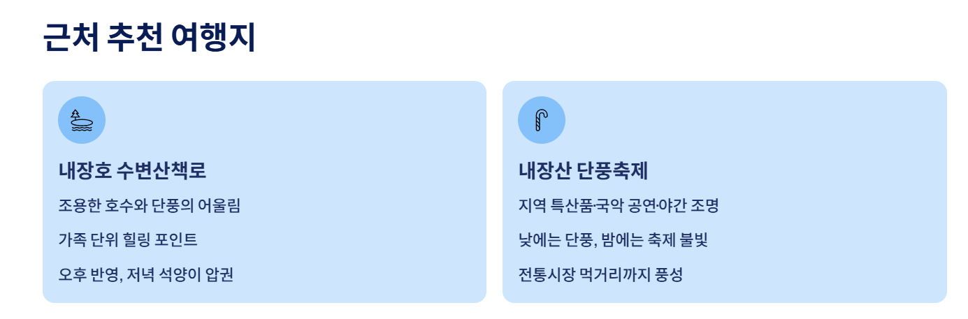 가을철에는 내장산문화광장에서 **‘정읍 내장산 단풍축제’**가 열립니다. 지역 특산품, 국악 공연, 야간 경관 조명 등 다양한 프로그램이 진행되어 단풍 구경 후 즐길 거리로 제격이에요. 특히 야간에는 불빛이 단풍잎에 반사되어 또 다른 낭만적인 풍경을 만들어줍니다.