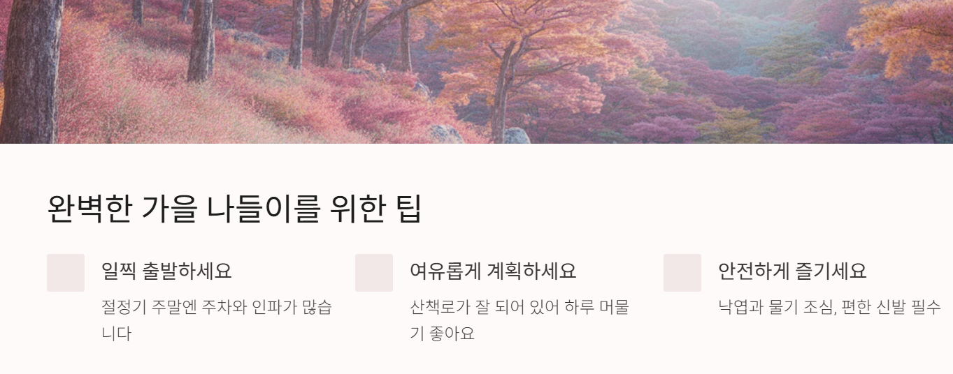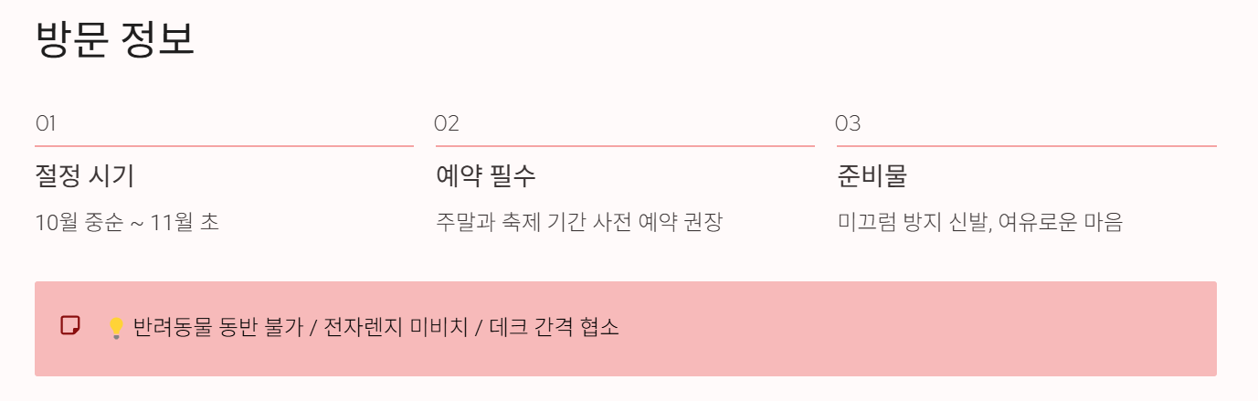따라서 단풍 절정기 주말 방문 시 상주차 차량·인파가 많을 수 있으니 일찍 출발하거나 여유 있게 계획하는 게 좋습니다.