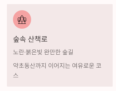 입구에서부터 약초동산 쪽으로 이어지는 완만한 숲길이 가을엔 노란·붉은빛으로 물들어 걷기 좋습니다. 이곳은 단풍이 시작될 때부터 색감이 풍부해 사진 찍기에도 예쁜 장소예요. 특히 “높은 가을하늘과 울긋불긋 물들기 시작한 나무사이로 가을 햇살과 바람을 받으며 숲 길 따라 천천히 걸어봅니다” 라는 후기가 있습니다.