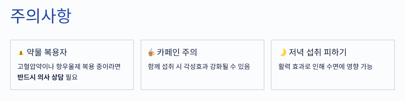 또한 카페인과 함께 섭취할 경우 각성효과가 강화될 수 있으므로, 저녁 시간대에는 피하는 것이 좋습니다.