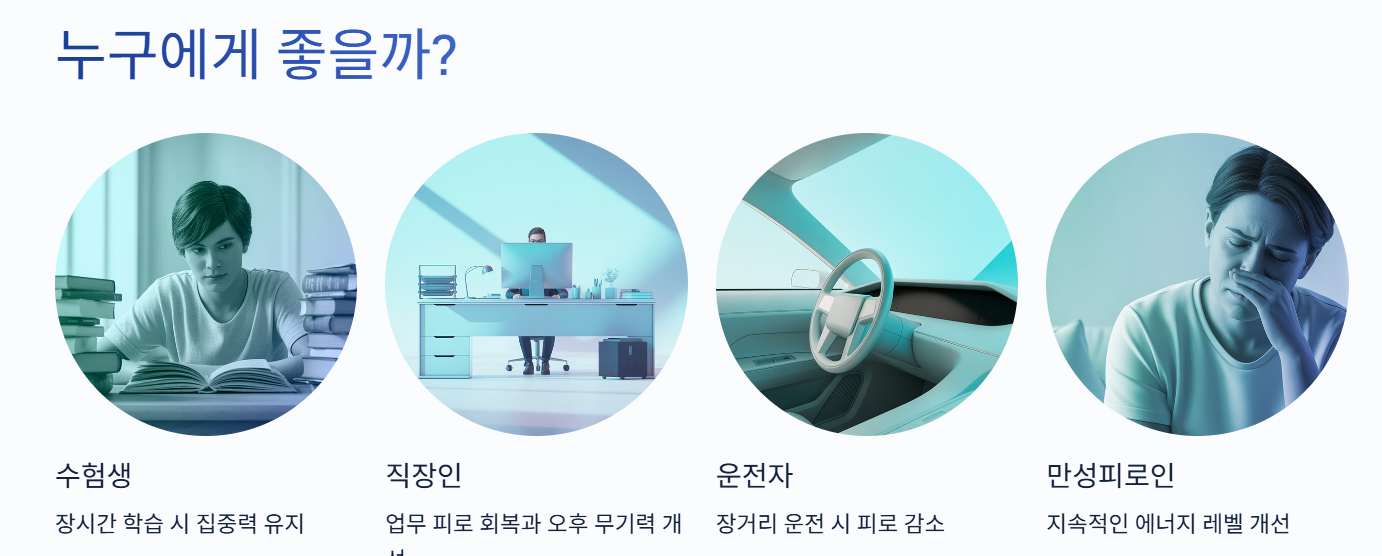 그렇기 때문에 수험생, 직장인, 장시간 운전하는 사람, 그리고 만성피로를 느끼는 분들에게 특히 도움이 됩니다.