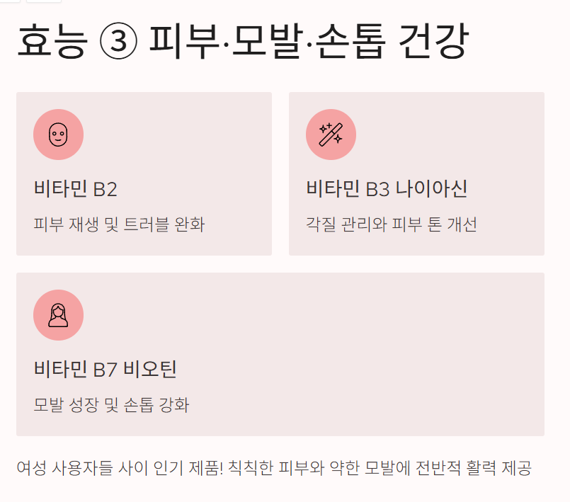 | 피부·모발 건강 | B2, B3, B7 | 트러블 완화, 모발 강화 |