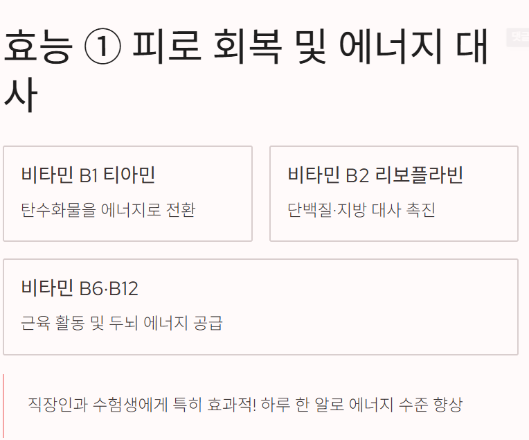 | 피로 회복 | B1, B2, B6 | 에너지 대사 촉진 |