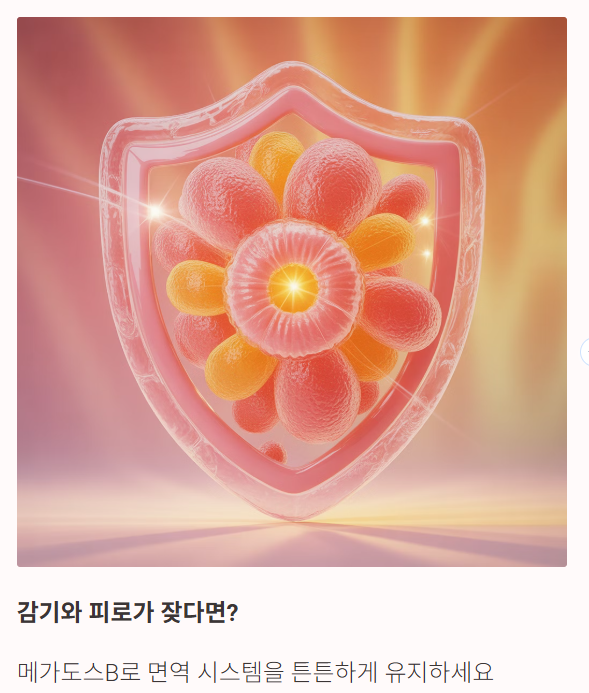 따라서 감기나 피로감이 잦은 사람에게 메가도스B는 면역 시스템을 튼튼하게 유지하는 데 도움이 됩니다.