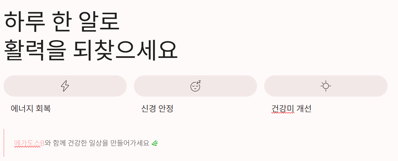 특히 ‘메가도스B’는 이름처럼 고함량 비타민B군을 한 번에 섭취할 수 있는 제품으로, 에너지 증진, 피로 회복, 집중력 향상에 탁월하다는 평가를 받고 있습니다.