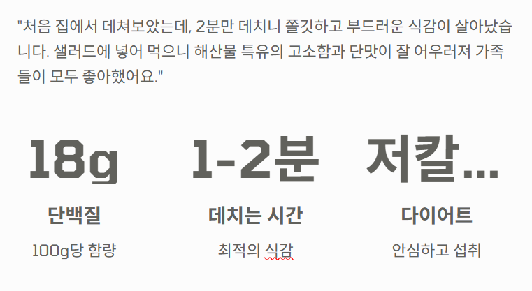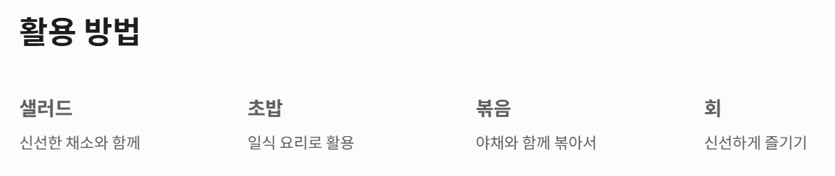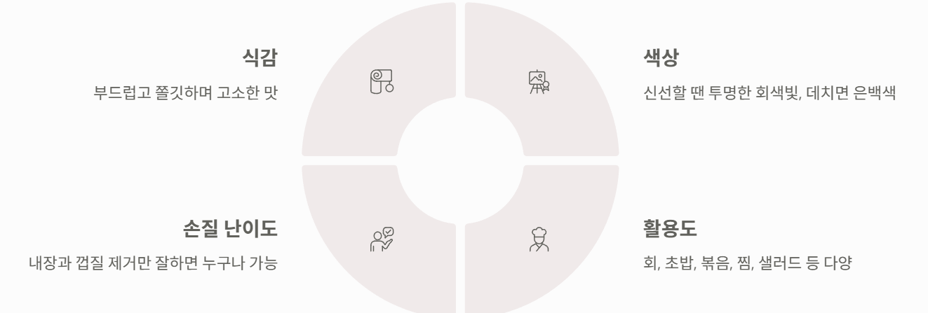 - 활용도: 회, 초밥, 볶음, 찜, 샐러드 등 다양한 요리에 활용 가능합니다.