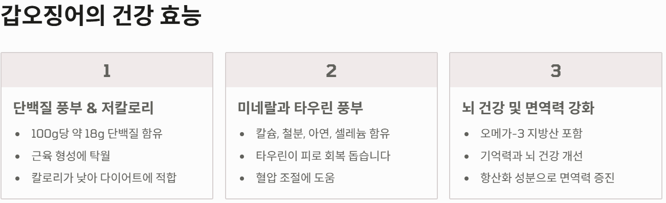 갑오징어는 단백질이 풍부하면서도 칼로리가 낮아 다이어트할 때 안심하고 먹을 수 있다는 점이 좋았습니다. 또한 타우린과 미네랄 덕분인지 먹고 나서 피로가 덜한 느낌을 받았습니다. 앞으로는 초밥이나 볶음 요리에도 활용하려고 합니다."
