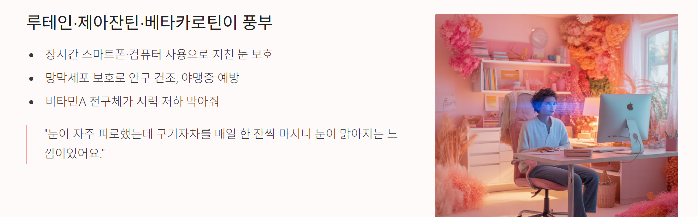 | 눈 피로 개선 | 장시간 컴퓨터 작업 후 눈이 맑아짐 |