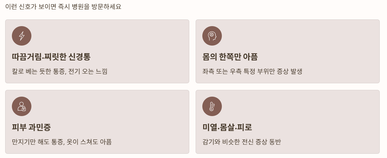 특히 신경통이 오래 남는 경우가 많기 때문에 초기증상을 정확히 아는 것이 매우 중요합니다.