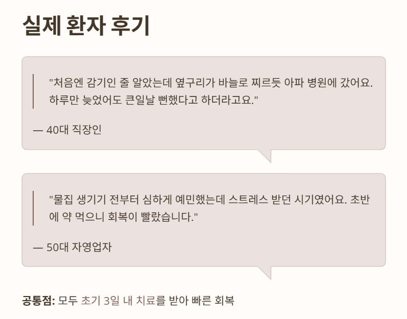 “처음엔 감기 몸살인 줄 알았는데 옆구리가 바늘로 찌르는 것처럼 아파 병원에 갔어요. 하루만 더 늦었으면 통증이 더 심해졌을 거라고 하더라고요. 약 먹고 일주일 정도 지나니 통증이 줄었어요. 초기에 병원 가는 게 정말 중요합니다.”