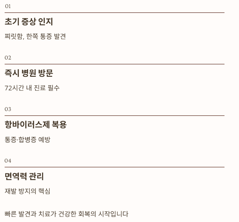 초기 징후가 의심된다면 즉시 병원에서 항바이러스 치료를 받는 것이 가장 좋은 예방법이며, 그 이후 면역력 관리가 재발 방지의 핵심입니다.