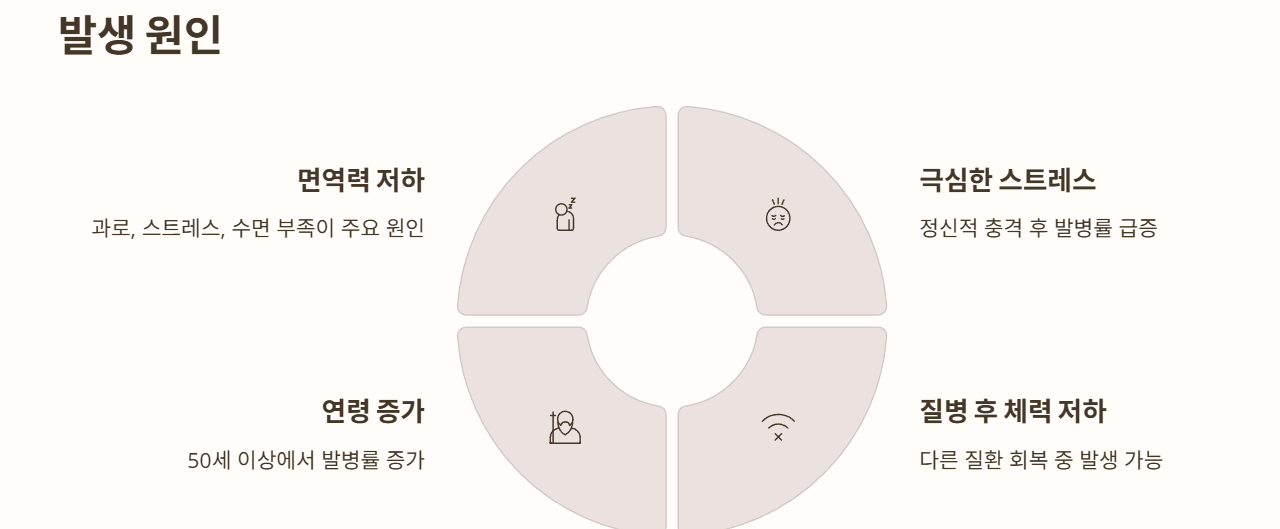 과로, 스트레스, 수면 부족, 질병 후 체력 저하가 가장 큰 유발 원인입니다.