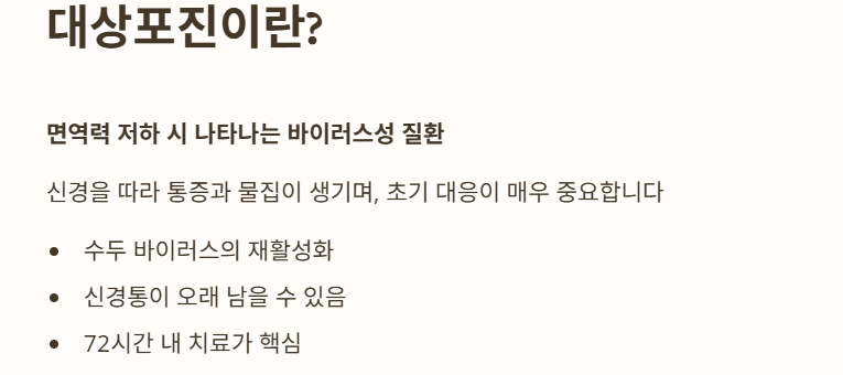 대상포진은 면역력이 떨어졌을 때 나타나는 대표적인 바이러스성 질환으로, 초기에 빠르게 발견하고 관리하면 통증과 합병증을 크게 줄일 수 있습니다.