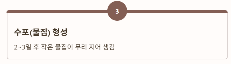 초기에 가려움이나 욱신거림, 붓는 느낌이 나타나고, 이후 그 자리에 물집이 생기기 시작합니다.