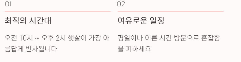 - 오전 10시 ~ 오후 2시 사이 햇살이 단풍에 잘 반사된다는 리뷰가 있어 이 시간대를 추천드립니다.