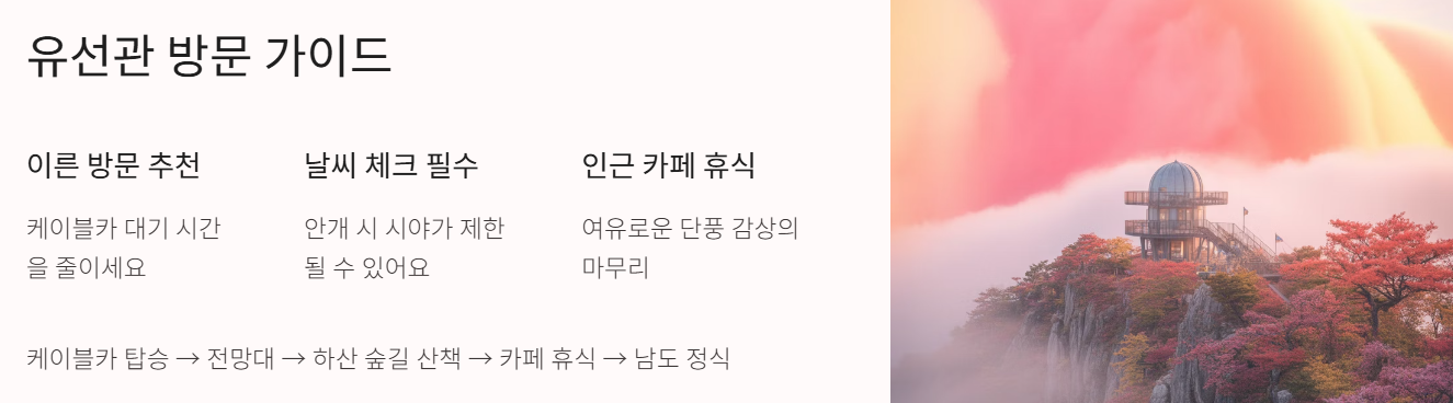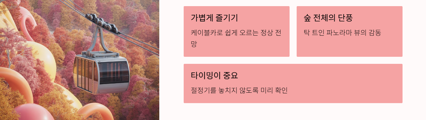 - 특히, 케이블카를 타고 정상 근처 전망대로 이동하면 숲 전체가 단풍으로 물든 파노라마 뷰를 경험할 수 있어 ‘가볍게 단풍 즐기기’에도 적합합니다.