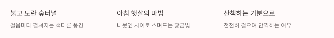 - 붉고 노란 단풍이 숲 전체를 물들이며, 걸음마다 색다른 풍경이 펼쳐져서 산책하는 기분으로도 충분히 만족스럽습니다. 후기 중에는 ‘아침 햇살 비집고 들어온 단풍나무에 넋을 잃었다’는 글도 있습니다.