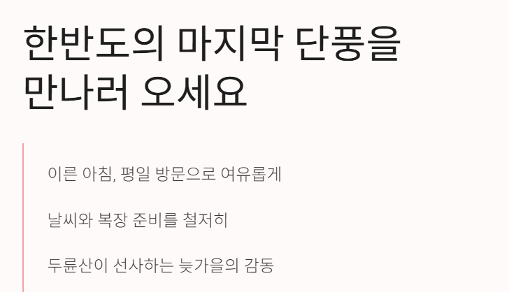 - 시기 선택이 중요해요. 두륜산은 남쪽이라 단풍 절정이 10월 말 ~ 11월 중순 사이라는 정보가 많습니다.