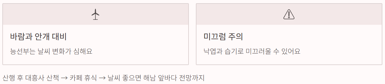- 능선부 쪽은 바람이 강할 수 있고, 아침엔 안개나 습기가 많아서 사진 찍을 땐 대비가 필요합니다.