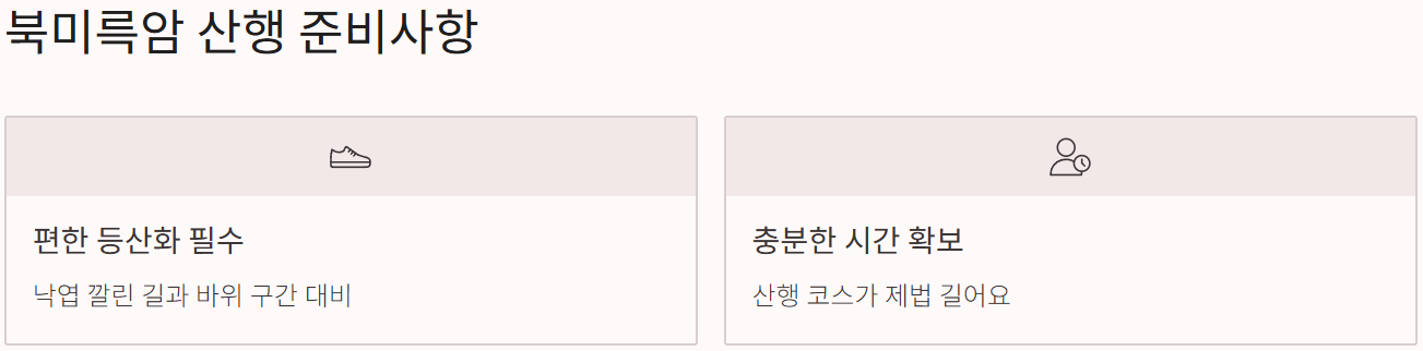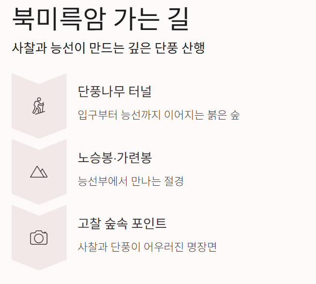 - 북미륵암 가는 길이나 능선부(노승봉, 가련봉 포함) 쪽은 사찰과 단풍이 어우러진 고찰 숲속 + 정상 뷰 포인트로 소개됩니다.