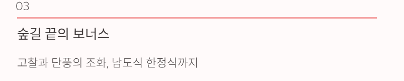 - 숲길 주차장에서 조금만 더 올라가면 카페 또는 산채비빔밥 등 전남 남도식 한정식도 많은데, 산행 전후 식사로 추천됩니다.