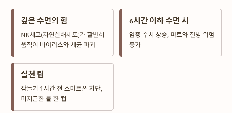 특히 깊은 수면 동안 NK세포(자연살해세포)가 활발히 움직여 체내 바이러스와 세균을 파괴합니다.