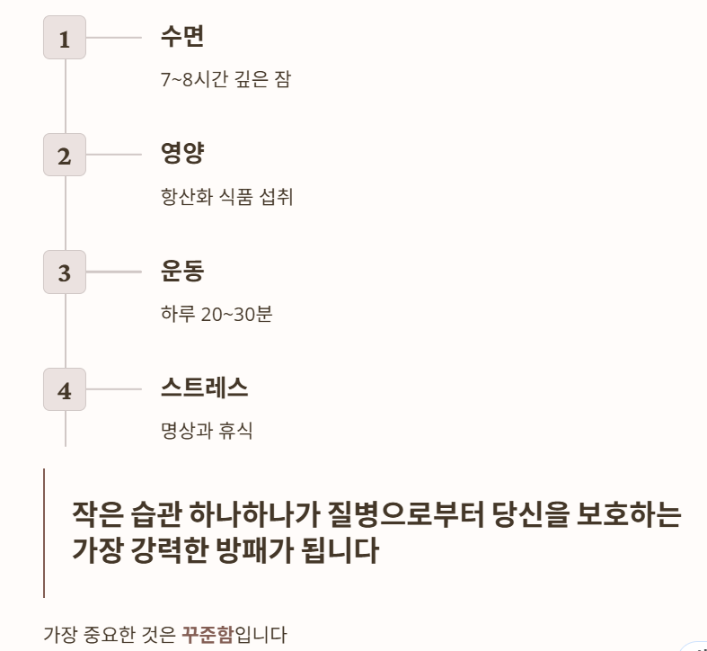 작은 습관 하나하나가 질병으로부터 당신을 보호하는 가장 강력한 방패가 됩니다.