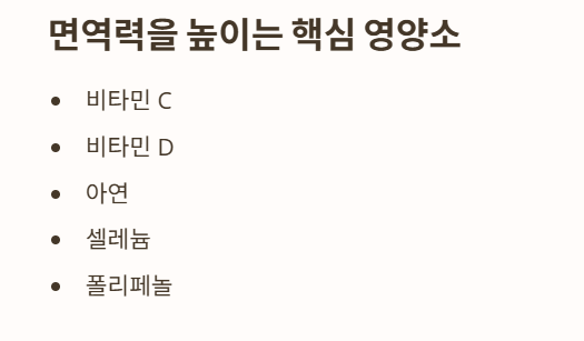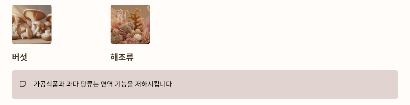 - 가공식품·과다 당류는 면역 기능을 떨어뜨릴 수 있어 절감이 필요합니다.