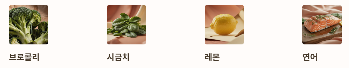 - 추천 식품: 브로콜리, 시금치, 레몬, 연어, 버섯, 해조류.