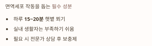 실내 생활이 많으면 부족해지기 쉬우므로 하루 15~20분 햇볕 쬐기가 효과적입니다.