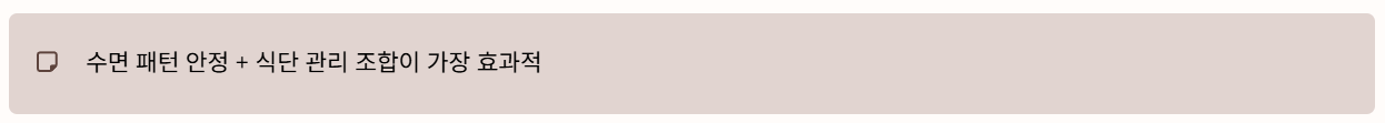 특히 수면 패턴 안정 + 식단 관리 두 가지 조합이 가장 효과적이었습니다.