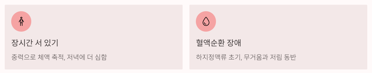 증상: 무거움, 저린 증상, 종아리 통증, 발등 눌렀을 때 바로 돌아오지 않음.