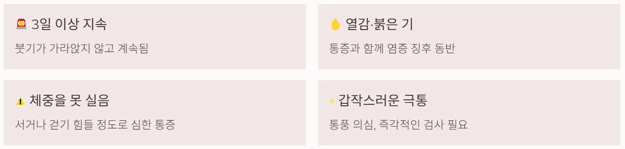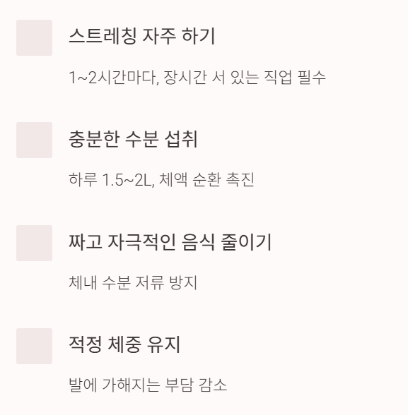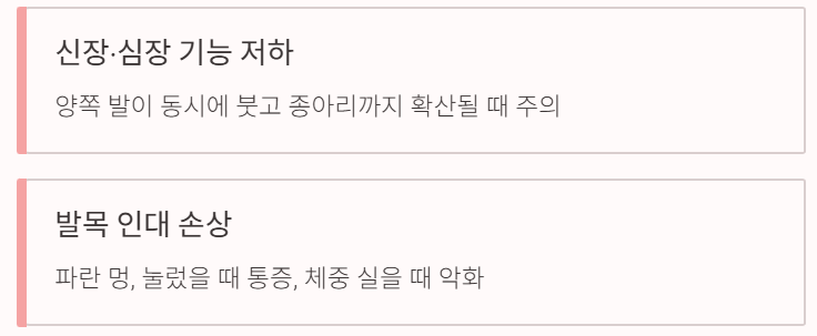 특징: 양쪽 발이 동시에 붓고 종아리까지 퍼질 때 주의해야 합니다.