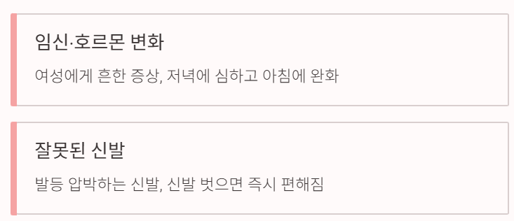 발등을 너무 압박하는 신발, 잘못된 아치(깔창) 착용도 부종을 유발합니다.