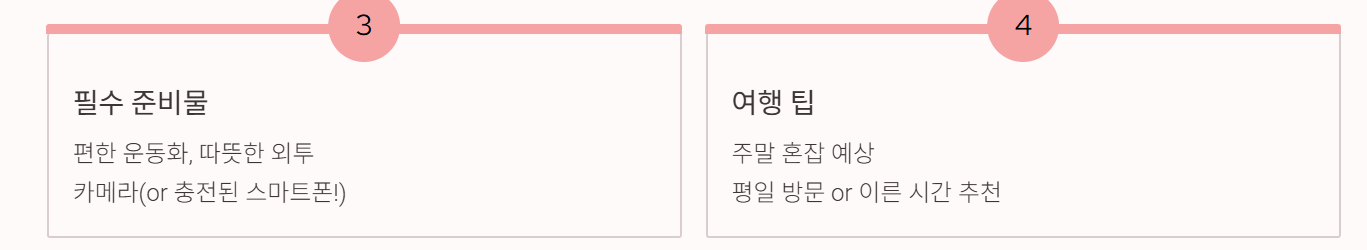 - 필수 준비물: 편한 운동화, 따뜻한 외투, 카메라