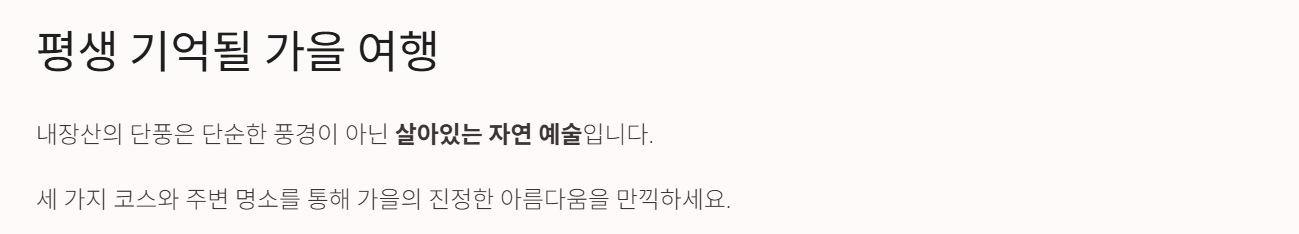 특히 내장사 코스의 단풍길과 케이블카 전망대의 파노라마 뷰는 평생 기억에 남는 감동을 줍니다.