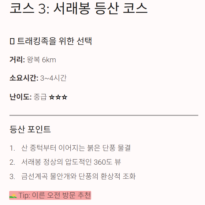 단풍 절정기에는 주말 산행객이 많으므로 이른 오전 시간대에 방문하는 것을 추천합니다.