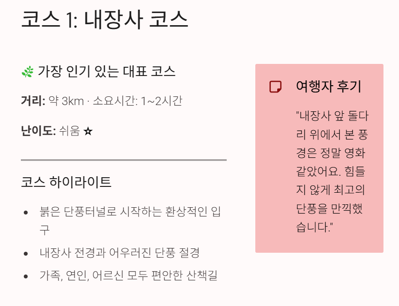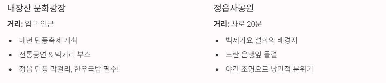 - 주차 정보: 내장산 정문 및 문화광장 주변 유료 주차장 다수