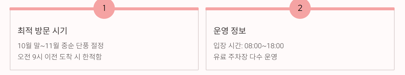 - 추천 방문 시간: 오전 9시 이전 방문 시 한적한 단풍길 감상 가능